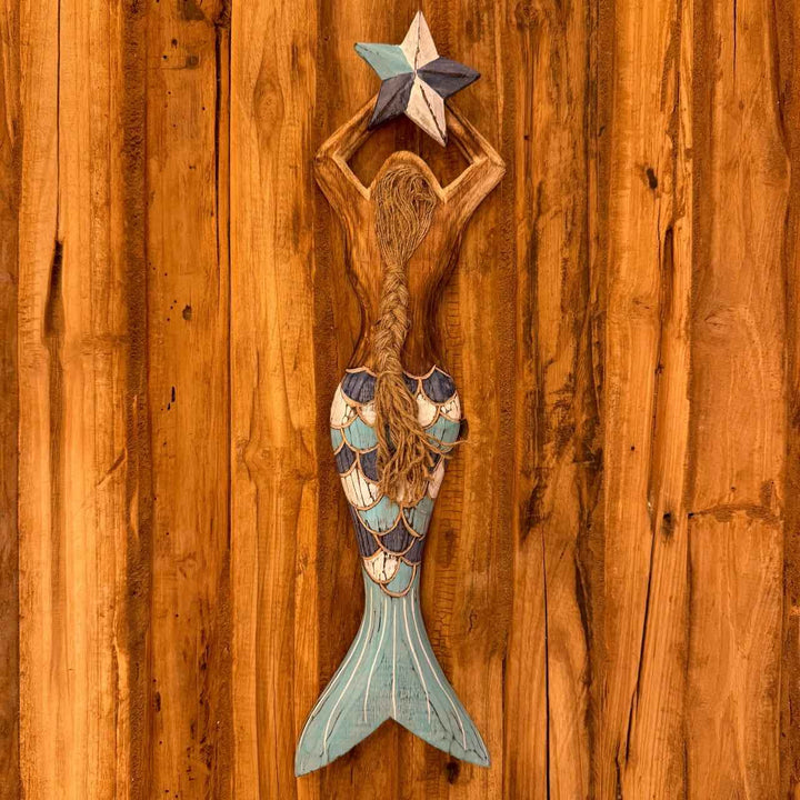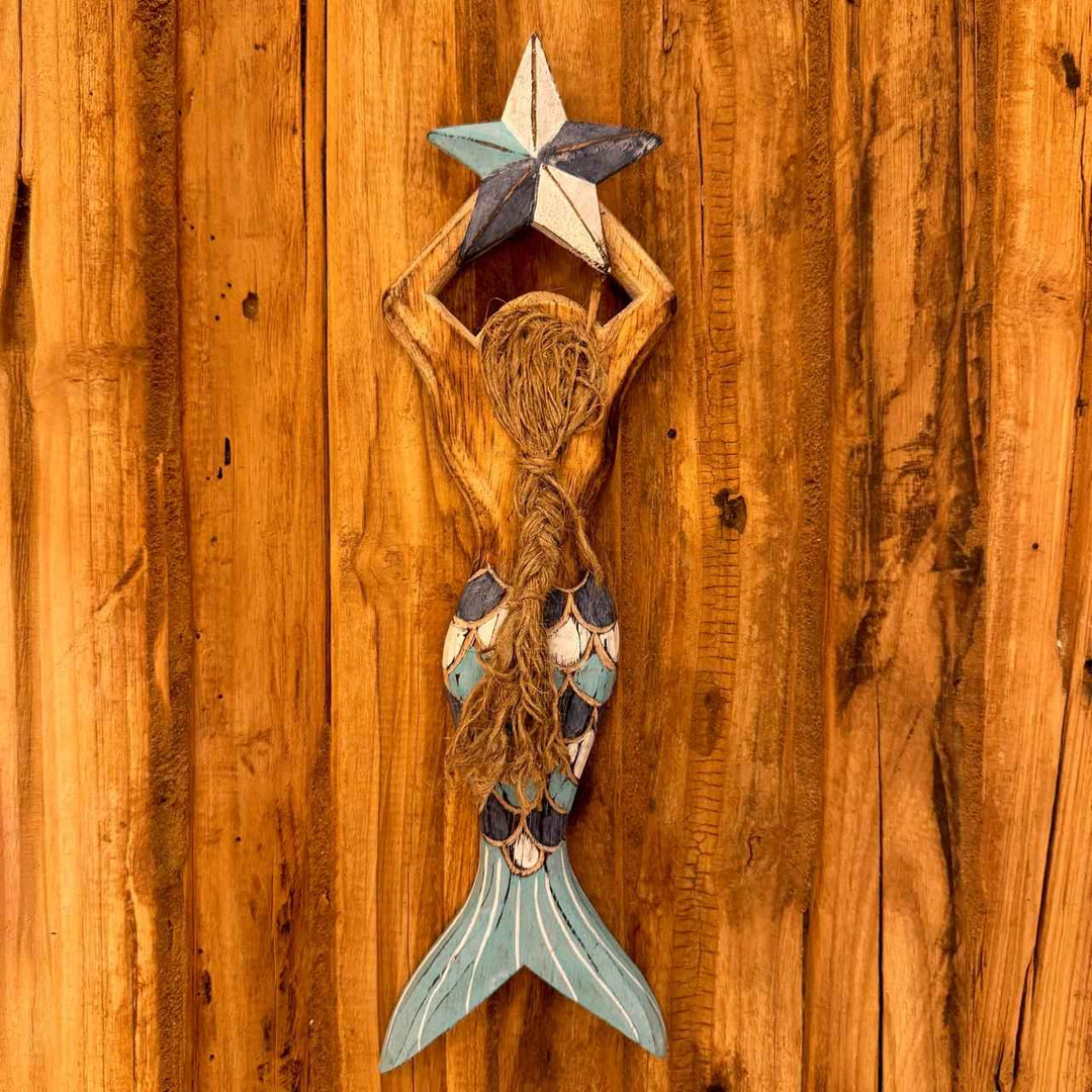 Adicione um toque rústico e zen à sua casa com esta linda sereia, que não é apenas uma peça decorativa, mas também uma expressão de arte e cultura. Transforme seu lar em um refúgio de tranquilidade e estilo com a Sereia de Madeira com Cabelos - Azul com Verde.