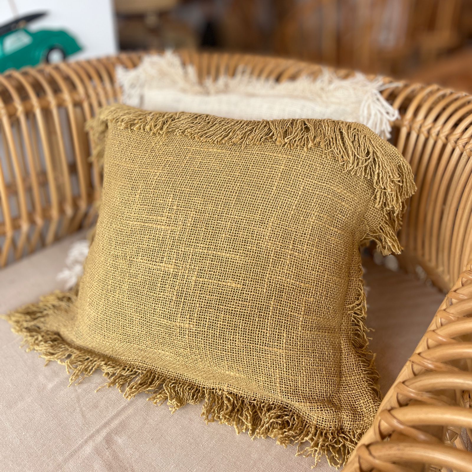 Almofada artesanal de linho marrom com franja, perfeita para adicionar um toque de elegância e estilo étnico à sua decoração. Feita à mão na Indonésia, esta almofada combina a beleza do design artesanal com a qualidade do material natural. O tom marrom neutro e a franja detalhada adicionam textura e sofisticação a qualquer ambiente. Ideal para sofás, poltronas ou camas, esta almofada é uma peça única que certamente chamará a atenção e complementará a decoração da sua casa com um toque exótico e acolhedor.