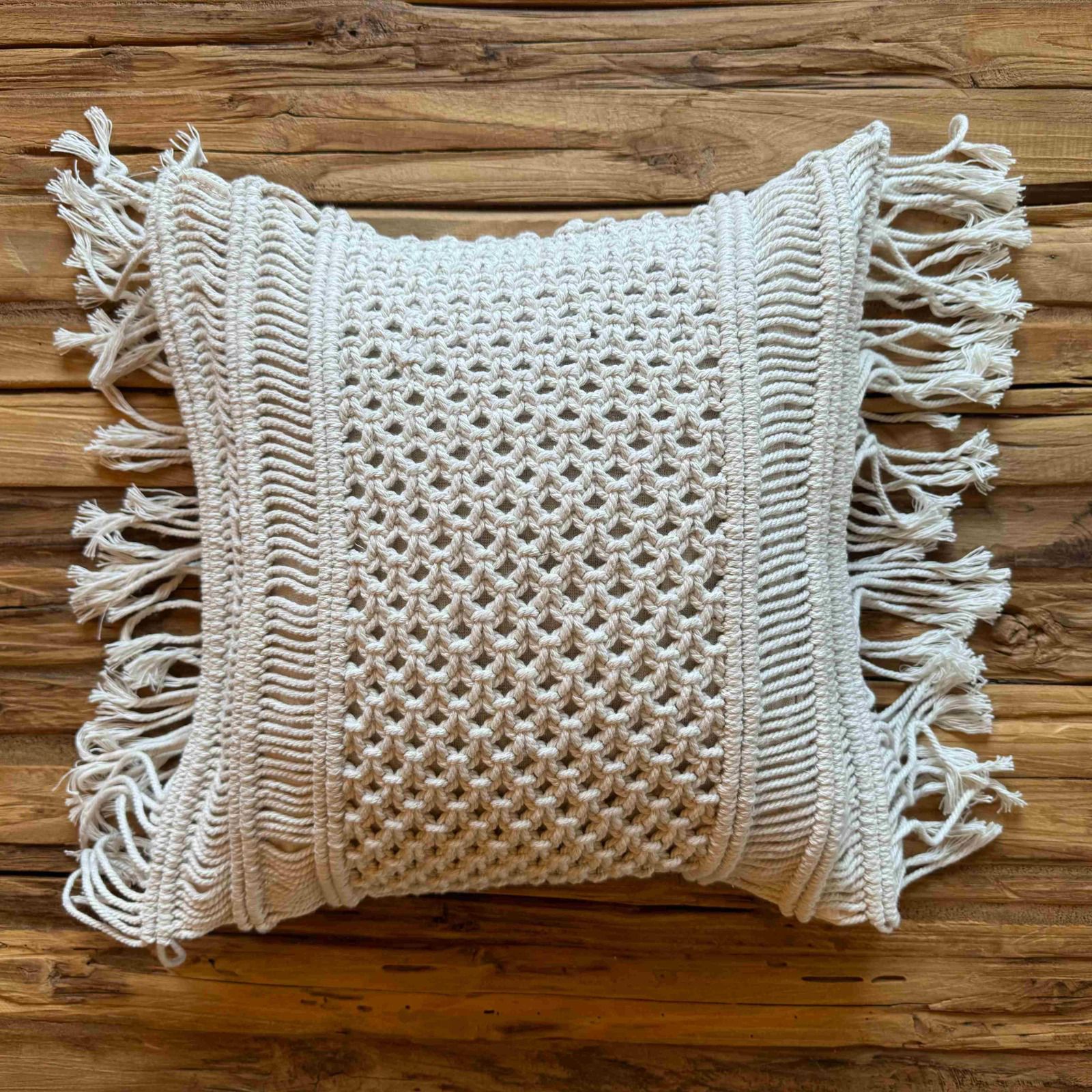 Almofada artesanal de macramê com 4 tiras, feita à mão por artesãos talentosos da Indonésia. Esta almofada traz um toque de elegância e estilo boêmio para qualquer ambiente. Com um design único e detalhes intricados, é perfeita para adicionar um toque de sofisticação e conforto à sua casa. Feita com materiais de alta qualidade, esta almofada é uma peça exclusiva que certamente se destacará na decoração do seu espaço. Adicione um toque de arte e artesanato indonésio à sua casa com esta bela almofada de macramê.